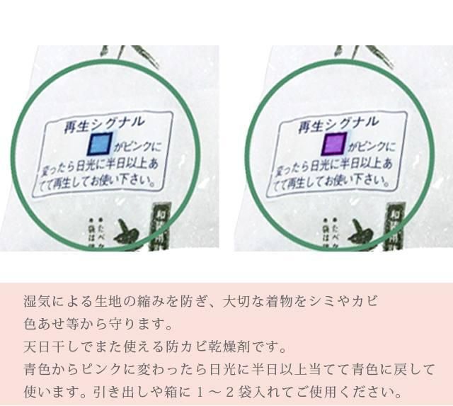 大切な着物を守る天日干しでまた使える、防カビ乾燥剤です。